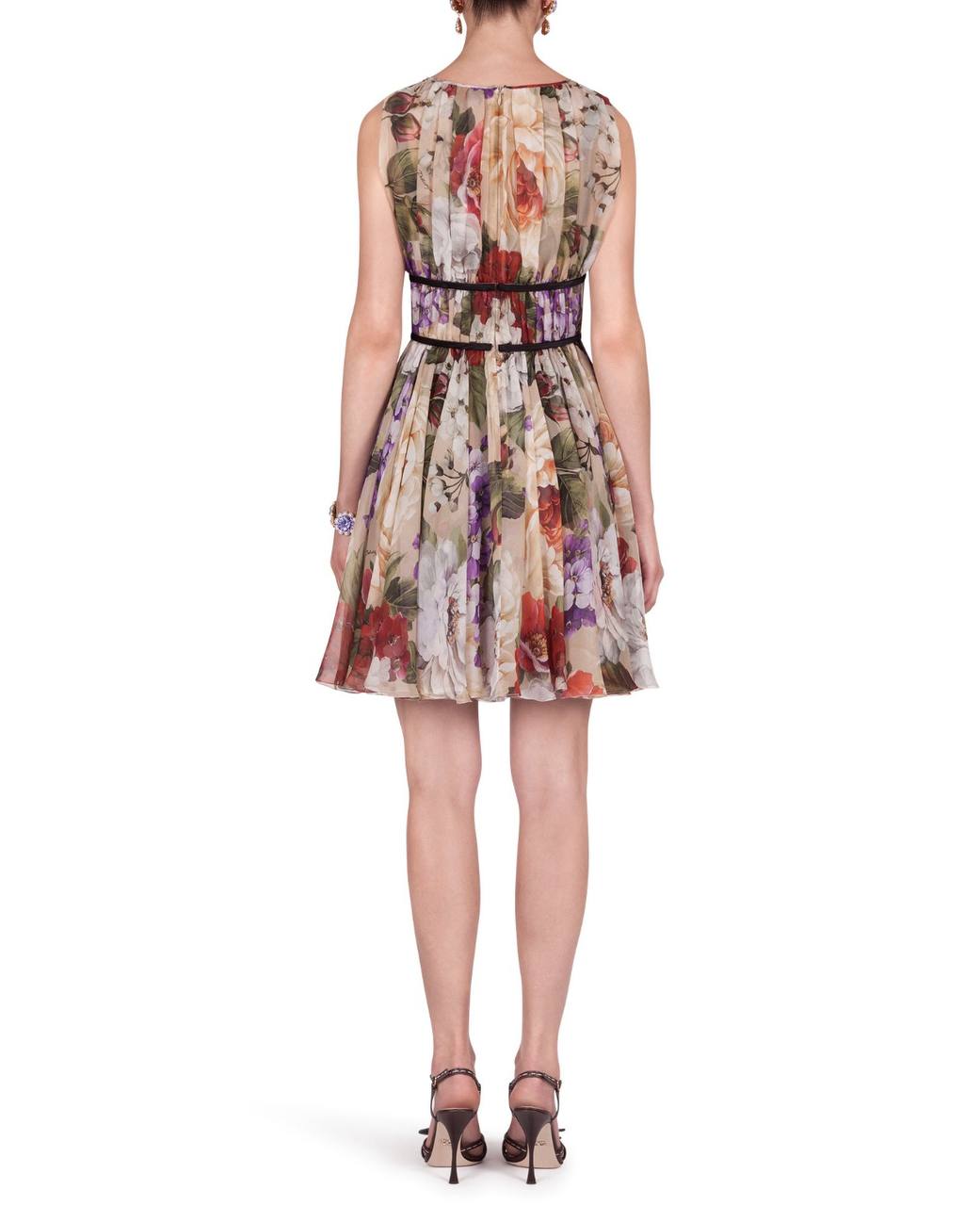 Элегантное короткое платье без рукавов с пышной юбкой и ярким цветочным принтом. Модель приталенного силуэта с акцентом на талии в виде двух тонких черных декоративных лент. Ткань украшена крупным реалистичным рисунком садовых цветов в красных, розовых и фиолетовых тонах на светлом фоне. Лиф и юбка оформлены мягкими складками, создающими воздушный объем. Состав: 100% шелк.