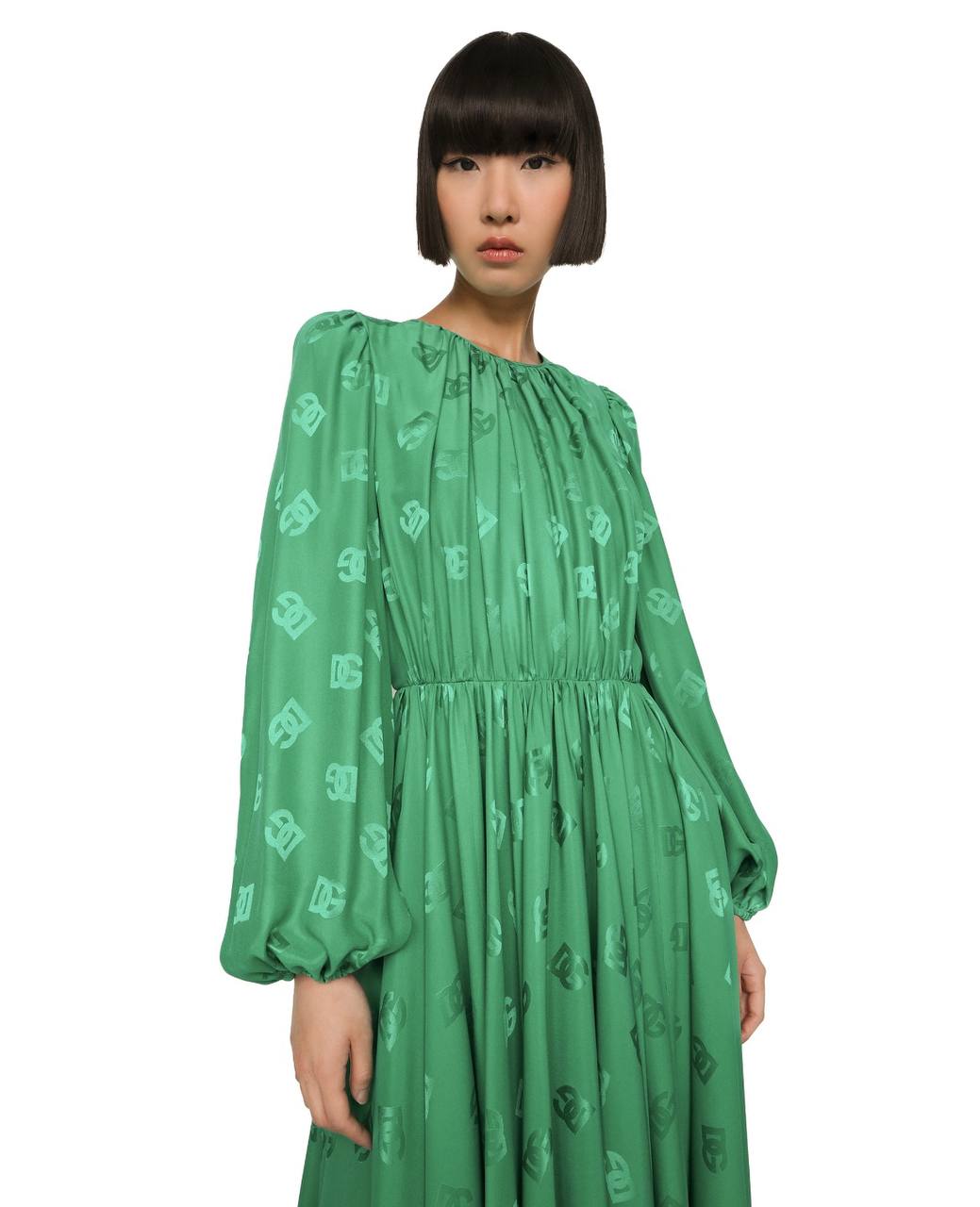 Элегантное зеленое платье длины макси с длинными объемными рукавами на манжетах и акцентированной талией. Модель украшена сплошным жаккардовым принтом в виде логотипа DG (Dolce & Gabbana). Круглый вырез горловины дополнен мягкими сборками, создающими летящий силуэт. Состав: 100% шелк.