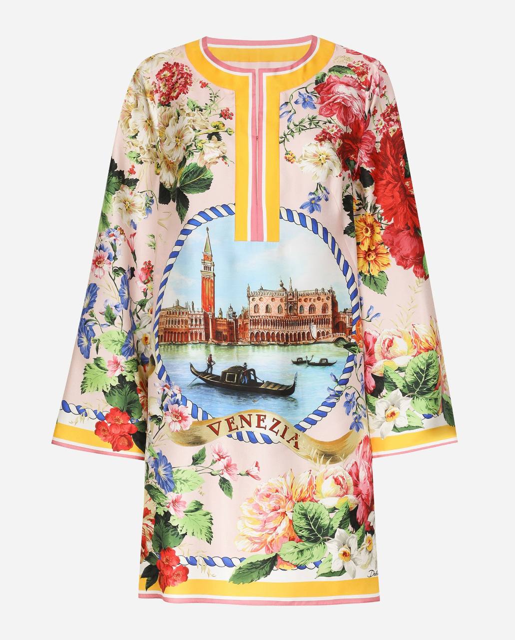 Элегантное женское платье-туника свободного кроя. Изделие выполнено в нежно-розовом цвете и украшено насыщенным цветочным принтом с розами и полевыми цветами. В центре расположена крупная графическая иллюстрация с видом на Венецию, изображением гондолы и надписью ‘VENEZIA’. Модель имеет длинные широкие рукава и круглый вырез с декоративной желто-розовой окантовкой. Состав: 100% шелк.
