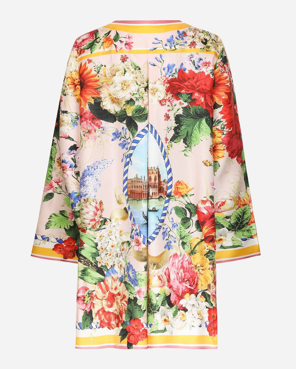 Элегантное платье прямого свободного кроя с ярким флористическим принтом на нежно-розовом фоне. Модель декорирована пышными цветочными композициями из роз и пионов, а в центре спинки расположен выразительный медальон с венецианским пейзажем. Изделие дополнено длинными рукавами и контрастной окантовкой по подолу и манжетам в желто-оранжевых тонах. Состав: 100% шелк.
