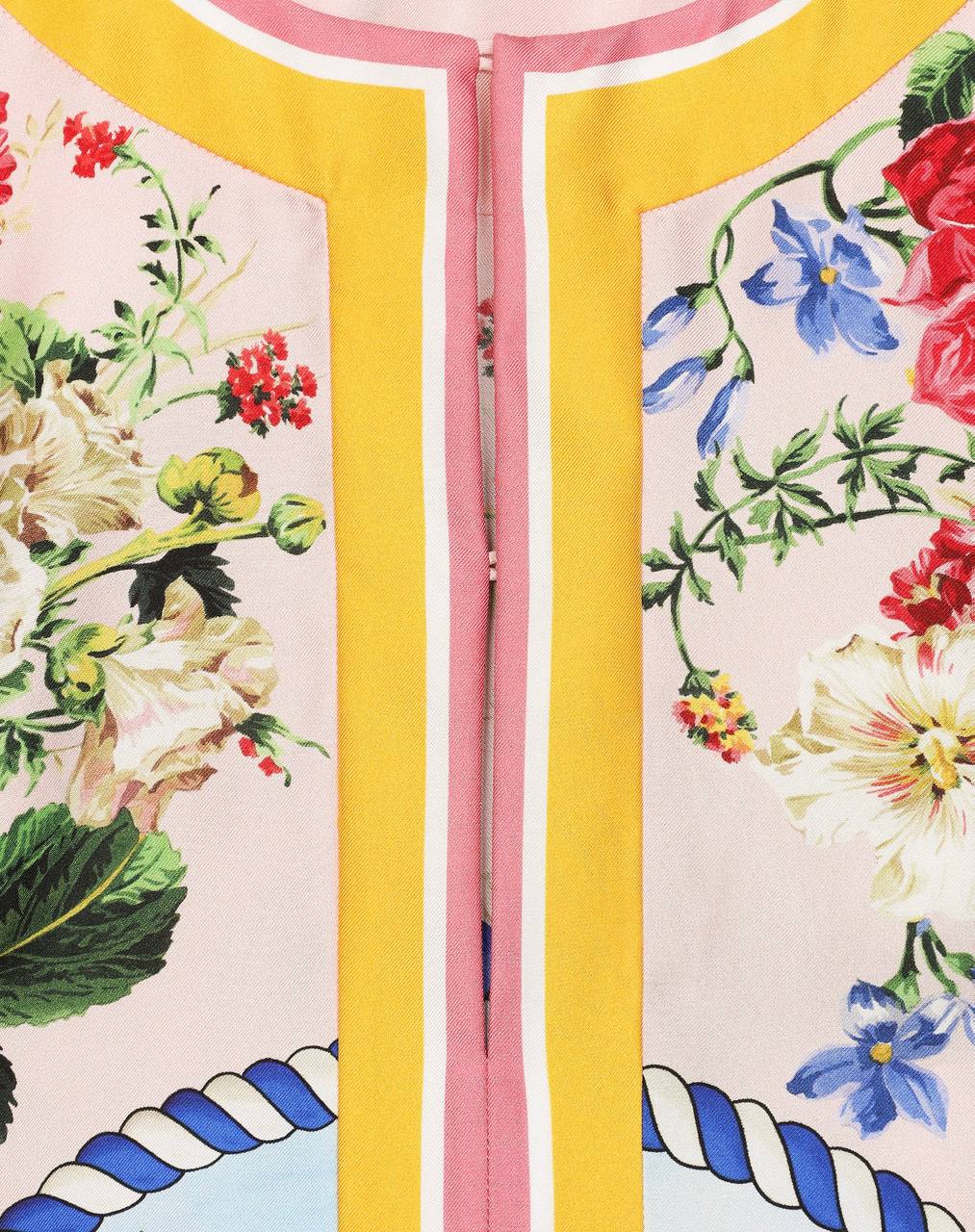 Элегантная блуза с красочным цветочным принтом на нежно-розовом фоне. Изделие дополнено декоративной контрастной отделкой в виде желтых и розовых полос вдоль центрального шва и горловины. Ткань имеет благородный шелковистый блеск. Состав: 100% шелк.