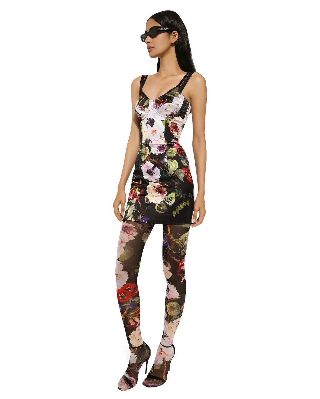 Элегантное короткое облегающее платье на тонких регулируемых бретелях с выразительным цветочным принтом на черном фоне. Модель имеет корсетный крой лифа с выделенными чашками, что выгодно подчеркивает фигуру. Ткань обладает легким благородным блеском. Состав: 94% шелк, 6% эластан.