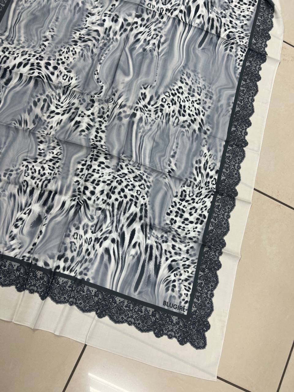 Изысканный женский платок от бренда BLUGIRL. Модель выполнена в серо-белой цветовой гамме с комбинированным принтом, сочетающим леопардовые пятна и абстрактные дымчатые разводы. Главной особенностью изделия является широкая кайма из черного кружева с цветочным узором по краям. В нижнем углу расположен контрастный логотип BLUGIRL. Ткань легкая, с благородным матовым блеском, по составу предположительно натуральный шелк или высококачественная вискоза.