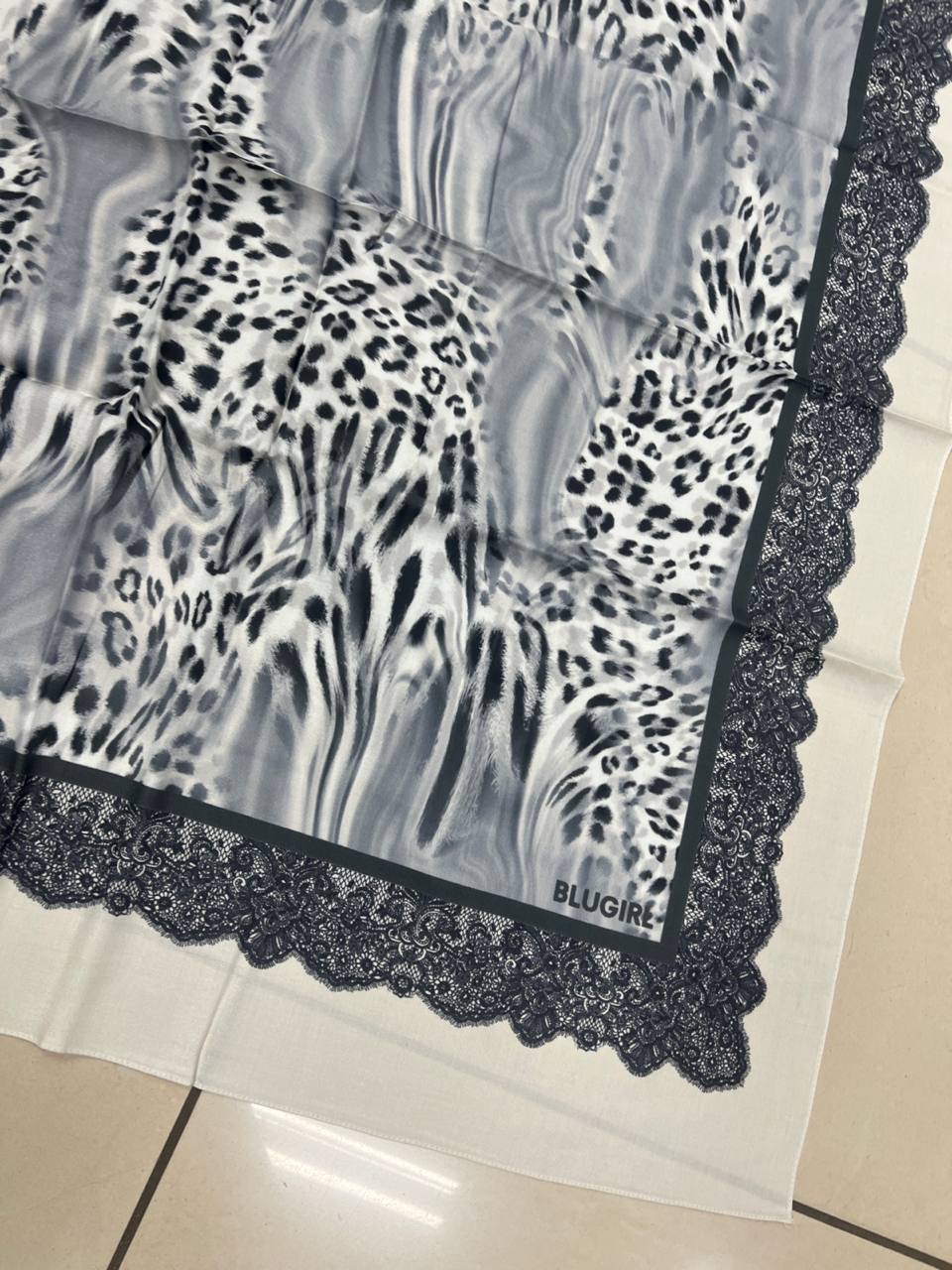 Элегантный женский платок от бренда Blugirl. Изделие выполнено в серо-белой цветовой гамме с комбинированным принтом: сочетание классического леопардового узора и абстрактных дымчатых разводов. Главной особенностью модели является широкая отделка из изысканного черного кружева с цветочным мотивом по краям. В углу расположен контрастный логотип ‘BLUGIRL’. Ткань обладает легким благородным блеском. Предположительный состав: шелк с добавлением вискозы.