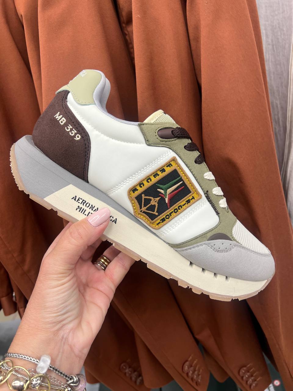 Стильные женские кроссовки Aeronautica Militare в многоцветном дизайне (коричневый, оливковый, серый, белый). Модель украшена крупным фирменным патчем ‘Frecce Tricolori’ на боковой панели и надписью ‘MB 339’ на заднике. Обувь на шнуровке с массивной многослойной подошвой бежевого цвета. Состав: верх выполнен из сочетания натуральной замши и текстиля, внутренняя отделка — текстиль, подошва — износостойкий полимер.