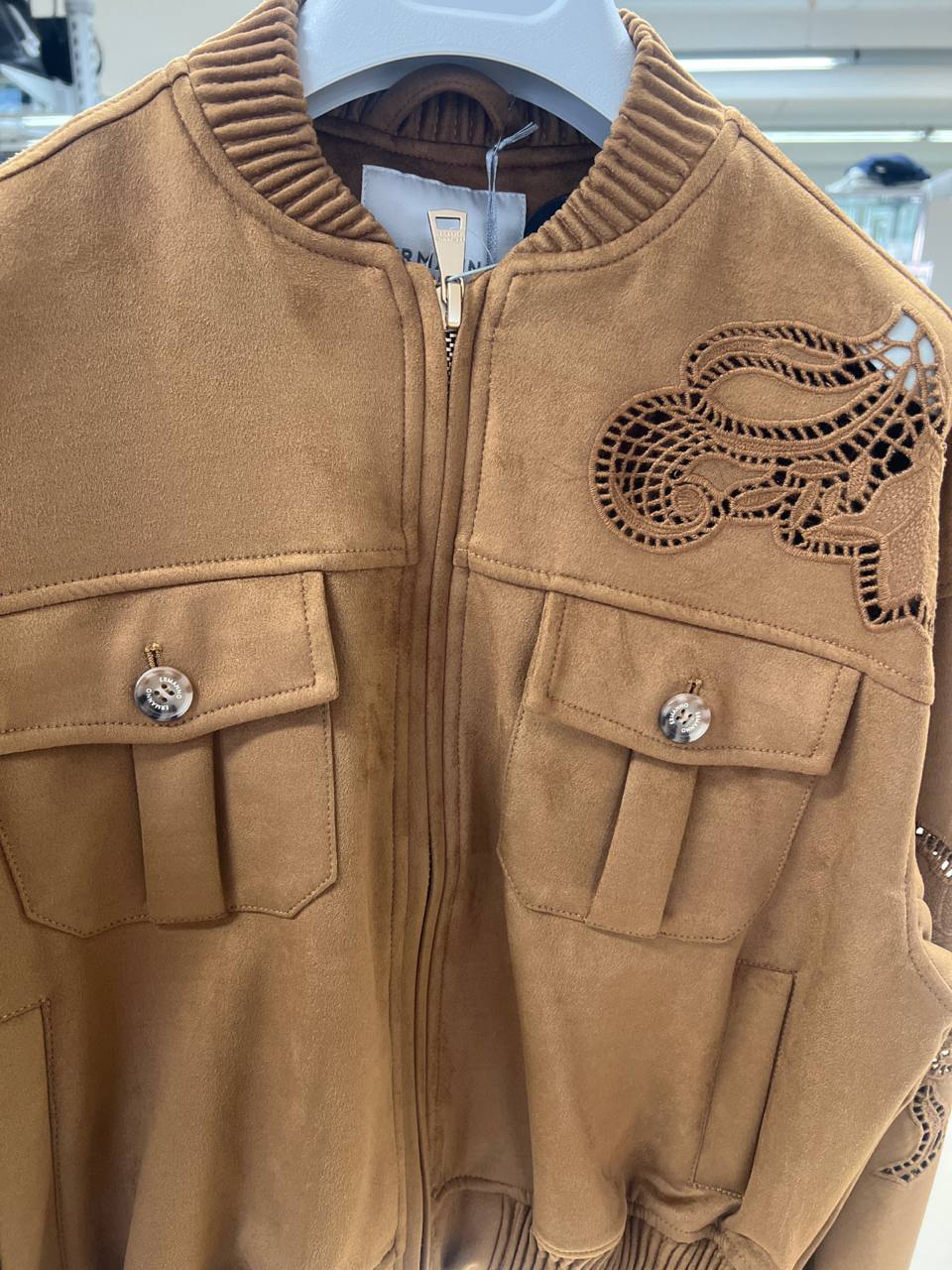 Элегантная куртка-бомбер от Ermanno Scervino в цвете кэмел. Модель выполнена из мягкого материала с фактурой под замшу. Главным акцентом является изысканная ажурная вышивка с перфорацией на груди и рукавах. Куртка застегивается на металлическую молнию, имеет трикотажный воротник-стойку и пояс в рубчик. На груди расположены два функциональных накладных кармана с клапанами на брендированных пуговицах. Предположительный состав: полиэстер с добавлением эластана (искусственная замша).