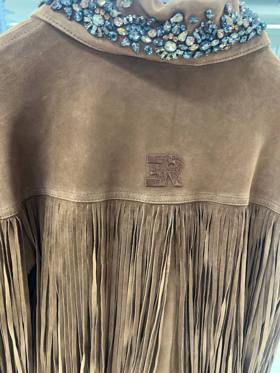 Эффектная женская куртка, выполненная из мягкой натуральной замши коричневого цвета. Модель в стиле вестерн/бохо декорирована длинной густой бахромой на спинке. Отложной воротник богато украшен крупными кристаллами и камнями синих, голубых и янтарных оттенков. На задней части изделия расположен фактурный тисненый логотип в виде букв «ER». Предположительный состав: 100% натуральная замша, подкладка из вискозы, декор кристаллами.