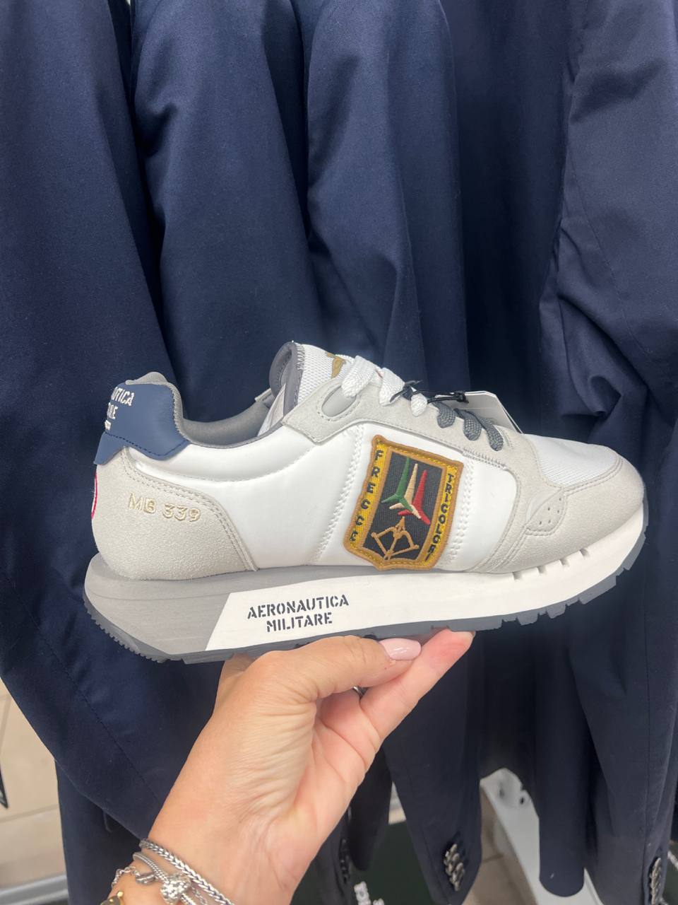 Стильные мужские кроссовки Aeronautica Militare в комбинированной расцветке (белый, серый, синий). Модель декорирована фирменным патчем Frecce Tricolori на боковой части, вышивкой MB 339 на пятке и логотипом бренда на массивной подошве. Дизайн дополнен контрастными вставками и классической шнуровкой. Состав: верх из натуральной кожи и замши с текстильными элементами, резиновая подошва.