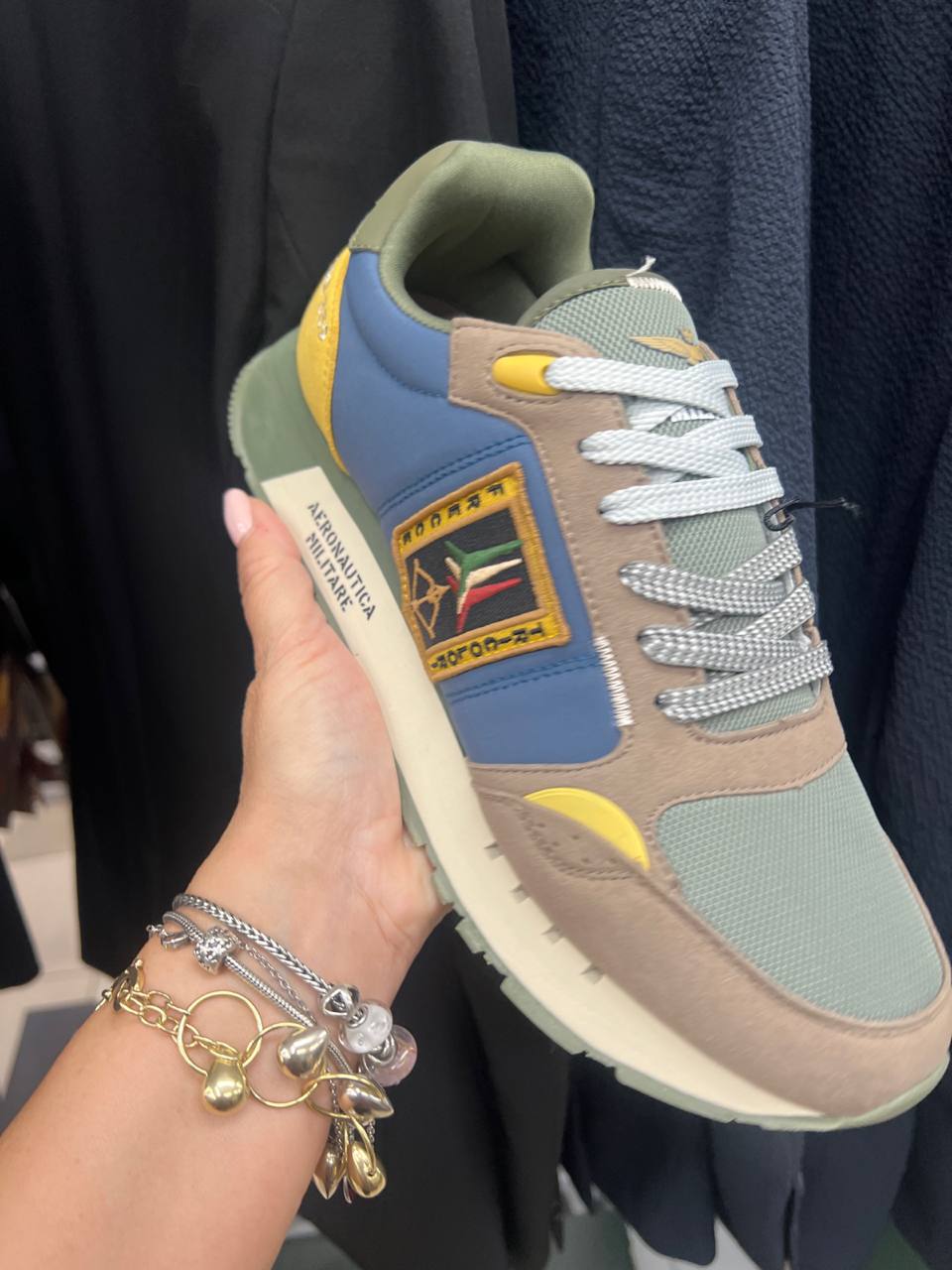 Мужские кроссовки Aeronautica Militare, выполненные в многоцветном дизайне с сочетанием бежевого, синего, серого и оливкового цветов. Модель декорирована фирменным патчем Frecce Tricolori на боковой панели и надписью с названием бренда на подошве. Классический силуэт дополнен контрастными желтыми элементами и светлой шнуровкой. Состав: натуральная замша, текстиль, подошва из высококачественной резины.