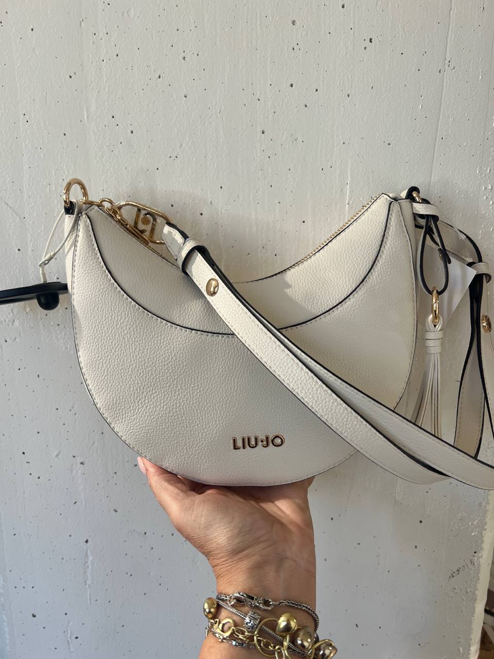 Элегантная женская сумка полукруглой формы (хобо) от бренда Liu Jo. Модель выполнена в молочно-белом цвете из качественной экокожи с выраженной зернистой фактурой. Передняя панель декорирована лаконичным металлическим логотипом золотистого цвета. Сумка закрывается на молнию, оснащена регулируемым плечевым ремнем и декоративной съемной кисточкой. Золотистая фурнитура подчеркивает премиальный стиль аксессуара. Состав: 100% полиуретан.