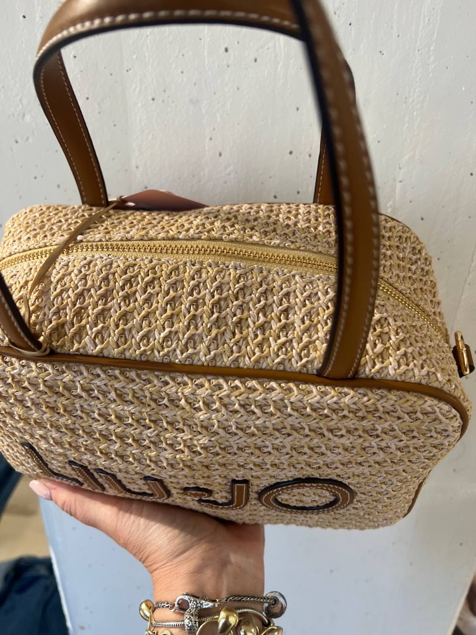 Элегантная женская сумка Liu Jo, выполненная в летнем стиле из плетёного материала (рафии) натурального бежевого цвета. Модель прямоугольной формы декорирована крупным вышитым логотипом бренда на лицевой стороне. Сумка дополнена двумя короткими ручками и отделкой из экокожи контрастного коричневого цвета. Основное отделение закрывается на металлическую молнию с золотистой фурнитурой. Состав: 100% рафия, отделка 100% полиуретан.