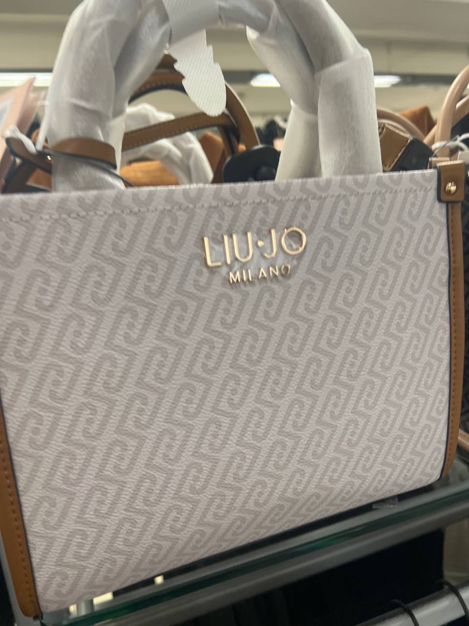 Элегантная женская сумка-тоут Liu Jo с фирменным монограммным принтом. Модель выполнена в сочетании молочного и серого цветов с контрастной коричневой отделкой. На лицевой стороне расположен объемный золотистый логотип ‘LIU JO MILANO’. Сумка имеет жесткую прямоугольную форму и две удобные верхние ручки. Состав: 100% полиуретан, подкладка — 100% полиэстер.