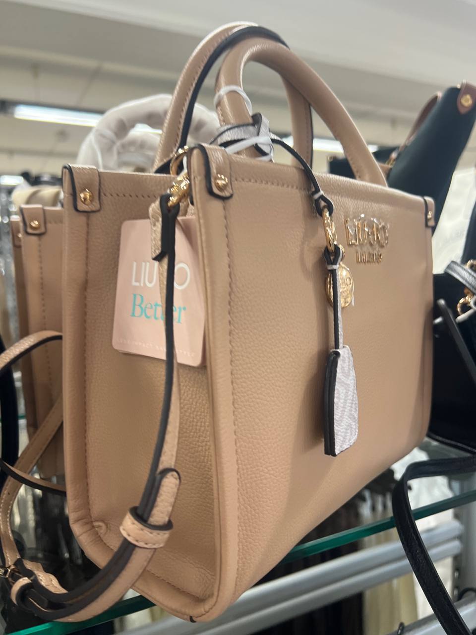 Элегантная женская сумка-тоут от Liu Jo в универсальном бежевом цвете. Модель выполнена из качественной экокожи с выраженной зернистой фактурой. Изделие дополнено золотистой фурнитурой и объемным металлическим логотипом бренда на лицевой панели. Сумка имеет две короткие ручки и съемный плечевой ремень, а также декорирована фирменным брелоком. Состав: 100% полиуретан.