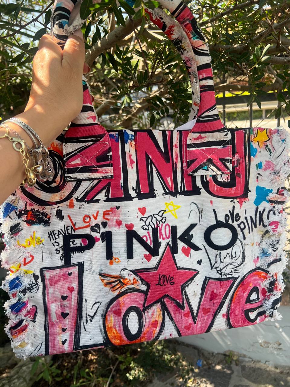 Яркая сумка-тоут от Pinko выполнена из плотного текстиля в стиле поп-арт с элементами граффити. Белое основание украшено крупным логотипом бренда, надписями ‘LOVE’, ‘HEAVEN’ и разнообразными рисунками в виде звезд и сердец в розовых, черных и желтых тонах. Модель имеет прямоугольную форму, две короткие ручки и модную отделку с необработанными краями и бахромой. Состав: 100% хлопок.