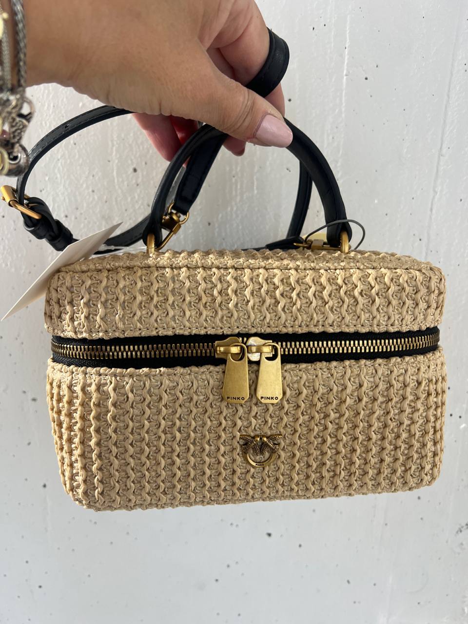 Элегантная плетеная сумка-кейс Pinko, выполненная в натуральном бежевом цвете с контрастными деталями из черной кожи. Модель имеет жесткую форму коробочки, дополненную короткой ручкой и регулируемым плечевым ремнем. Лицевая сторона декорирована узнаваемым золотистым логотипом Love Birds. Сумка закрывается на круговую молнию с брендированными пуллерами. Состав: 80% рафия, 20% натуральная кожа, металлическая фурнитура.