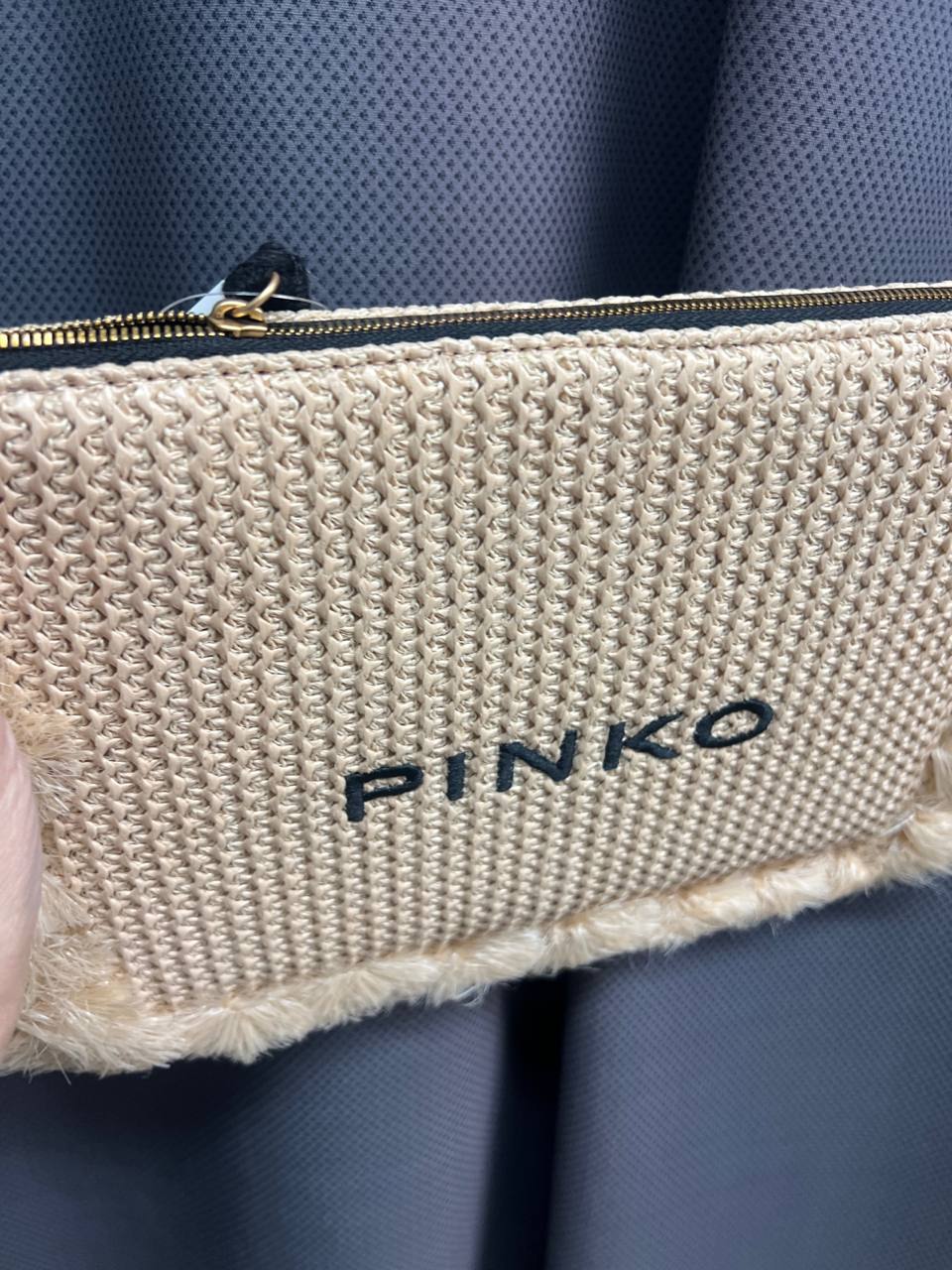 Стильный клатч-косметичка Pinko в бежевом цвете. Модель выполнена из комбинированных материалов: верхняя часть имеет плетеную фактуру с контрастным черным логотипом бренда, а нижняя декорирована мягким искусственным мехом в тон. Аксессуар застегивается на металлическую молнию золотистого цвета. Состав: полипропилен, полиэстер, металл.