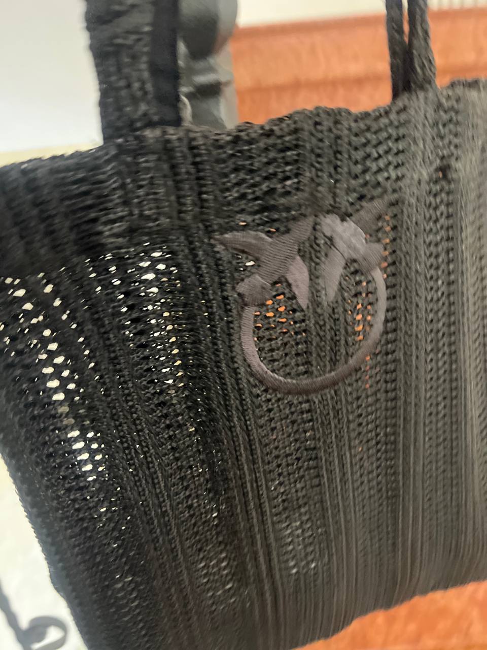 Элегантная женская сумка-шопер черного цвета, выполненная из сетчатого трикотажа с фактурным вертикальным плетением. Лицевая сторона декорирована вышитым логотипом в виде двух птиц в тон изделия. Модель имеет открытый верх и две удобные ручки. Состав: 100% полиэстер.