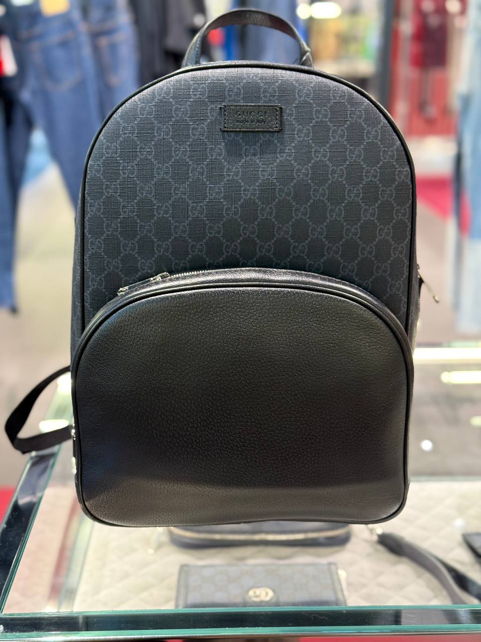 Элегантный рюкзак Gucci выполнен из знакового полотна GG Supreme в черно-серой гамме. Модель дополнена объемным накладным карманом из черной зернистой кожи на молнии. На фронтальной части расположена кожаная нашивка с тисненым логотипом бренда. Рюкзак оснащен верхней кожаной ручкой и регулируемыми плечевыми ремнями. Состав: канва GG Supreme (полиуретановое покрытие, хлопок, полиэстер), отделка из 100% натуральной телячьей кожи, подкладка из прочного текстиля.