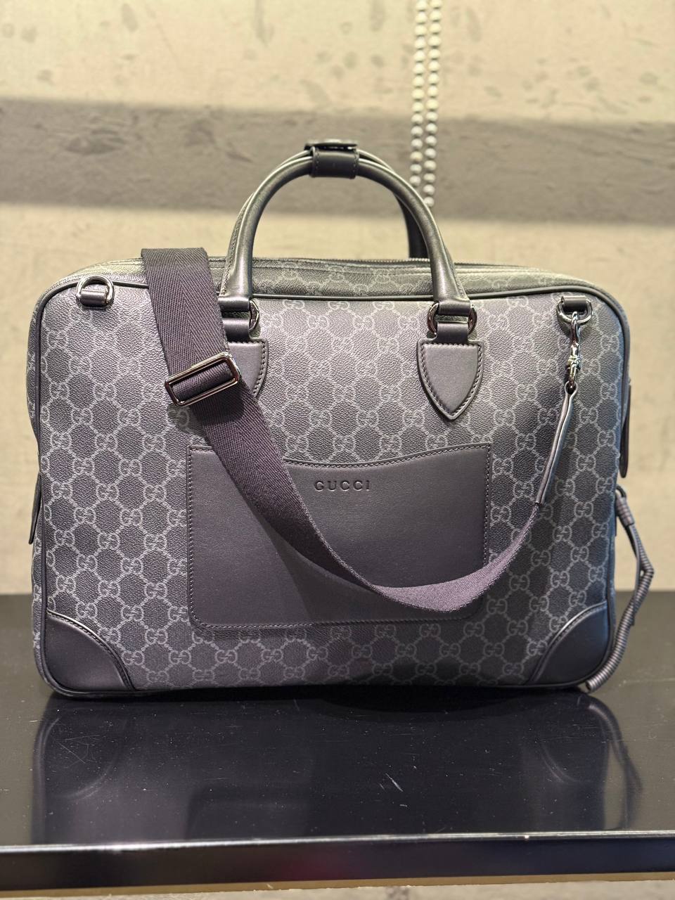 Стильная мужская сумка-портфель в серо-черной гамме, украшенная легендарным узором GG Supreme. Модель имеет лаконичный дизайн с отделкой из натуральной кожи черного цвета. На переднем накладном кармане расположен тисненый логотип GUCCI. Портфель оснащен двумя удобными кожаными ручками и съемным регулируемым плечевым ремнем из текстиля. Состав: канва GG Supreme, натуральная кожа, текстиль, металлическая фурнитура.