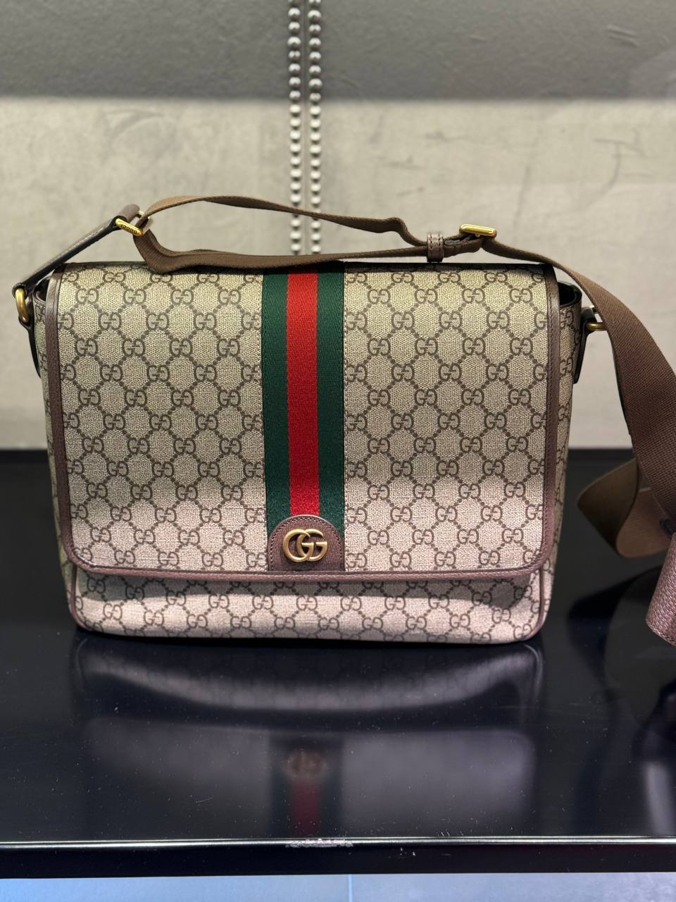 Сумка-мессенджер Gucci Ophidia выполнена из классической канвы GG Supreme в бежево-коричневой гамме. Модель дополнена знаковой красно-зеленой лентой Web по центру и золотистым логотипом Double G на клапане. Аксессуар имеет отделку из коричневой кожи и регулируемый плечевой ремень из текстиля. Состав: канва GG Supreme, натуральная кожа, текстиль, металлическая фурнитура.