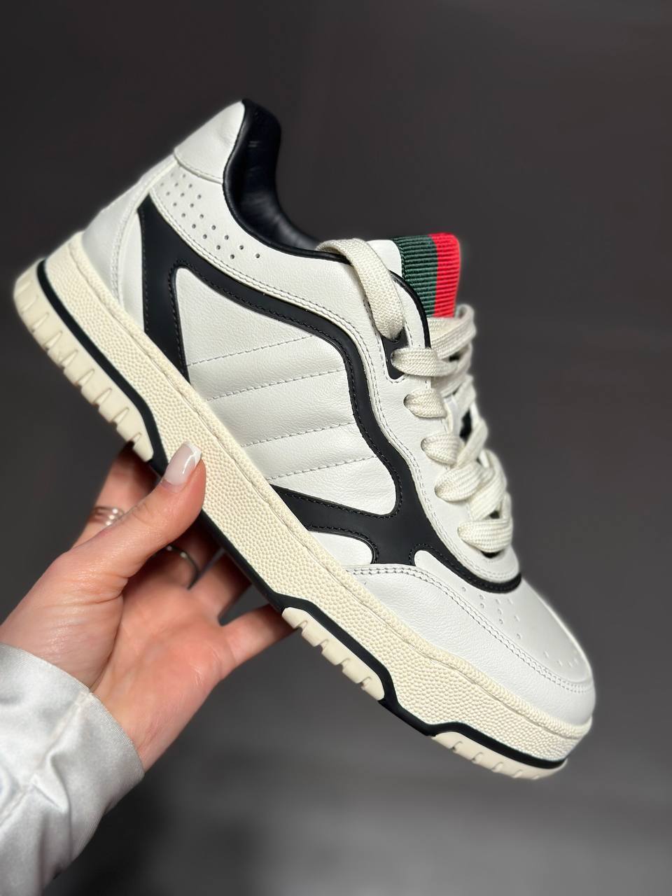 Стильные женские кроссовки из натуральной кожи белого цвета с эффектными контрастными вставками черного цвета. Модель дополнена характерной красно-зеленой текстильной лентой на язычке. Перфорированные детали на мыске и пятке обеспечивают воздухообмен. Плоская шнуровка в тон и массивная резиновая подошва с текстурным рисунком гарантируют комфорт и устойчивость. Состав: верх — натуральная кожа, подкладка — текстиль/кожа, подошва — 100% резина.