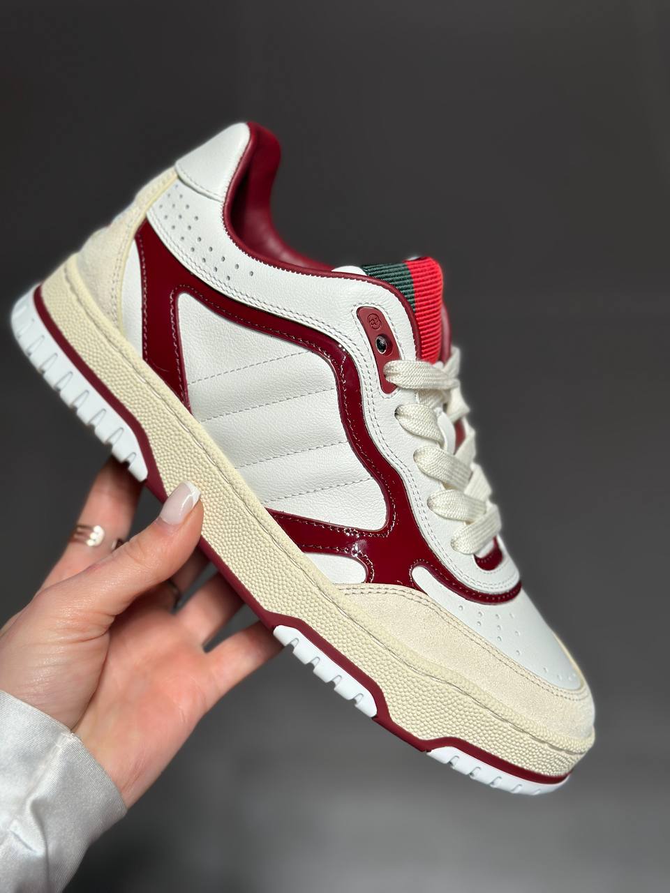 Стильные женские кроссовки Gucci в ретро-дизайне. Модель выполнена из комбинации гладкой белой кожи и вставок из светло-бежевой замши. Обувь декорирована контрастными деталями бордового цвета и характерной перфорацией. На язычке расположена фирменная красно-зеленая лента Web, а на верхнем люверсе — миниатюрный логотип Interlocking G. Текстурированная массивная подошва кремового оттенка обеспечивает комфорт при ходьбе. Состав: натуральная кожа, замша, текстильная подкладка, резиновая подошва.