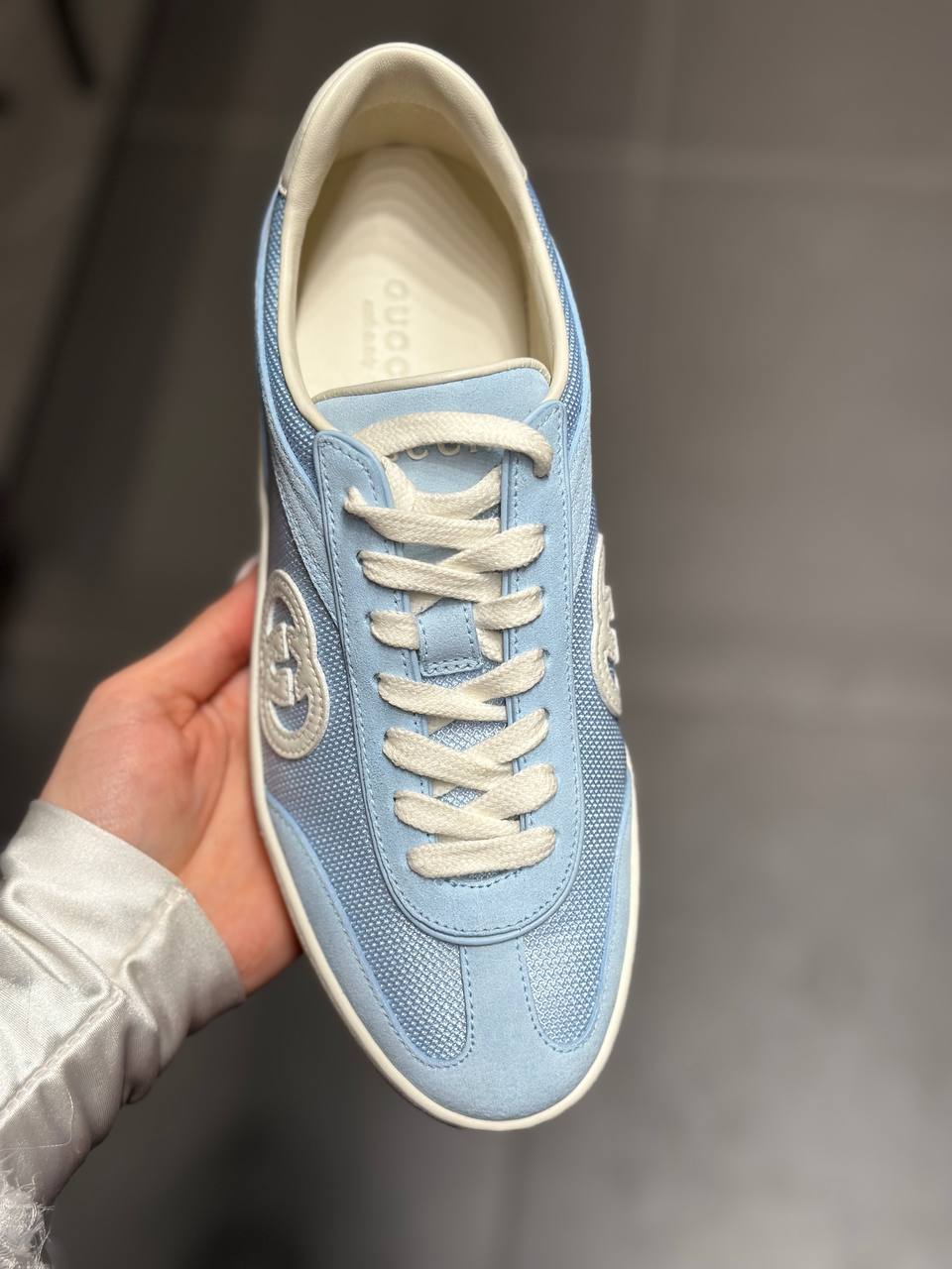Элегантные женские кеды Gucci в нежно-голубом цвете. Модель выполнена в спортивном стиле с использованием комбинированных материалов: сетчатого текстиля и вставок из мягкой натуральной замши. Боковая панель декорирована объемным логотипом Interlocking G, а язычок украшен фирменной надписью бренда. Завершают образ классическая белая шнуровка и светлая подошва. Состав: верх — натуральная замша и текстиль; подкладка — текстиль; подошва — резина.