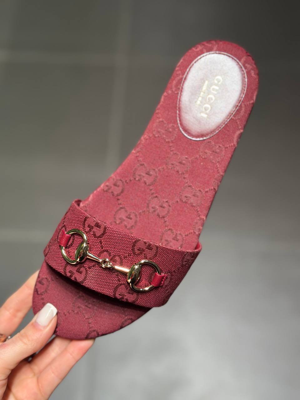 Элегантные женские шлепанцы Gucci в насыщенном бордовом цвете. Модель выполнена из прочного текстиля с узнаваемым жаккардовым узором GG Supreme. Верх изделия декорирован фирменной золотистой фурнитурой Horsebit. Кожаная стелька дополнена тисненым логотипом бренда. Состав: верх — текстиль (канва), отделка и стелька — натуральная кожа, подошва — натуральная кожа.
