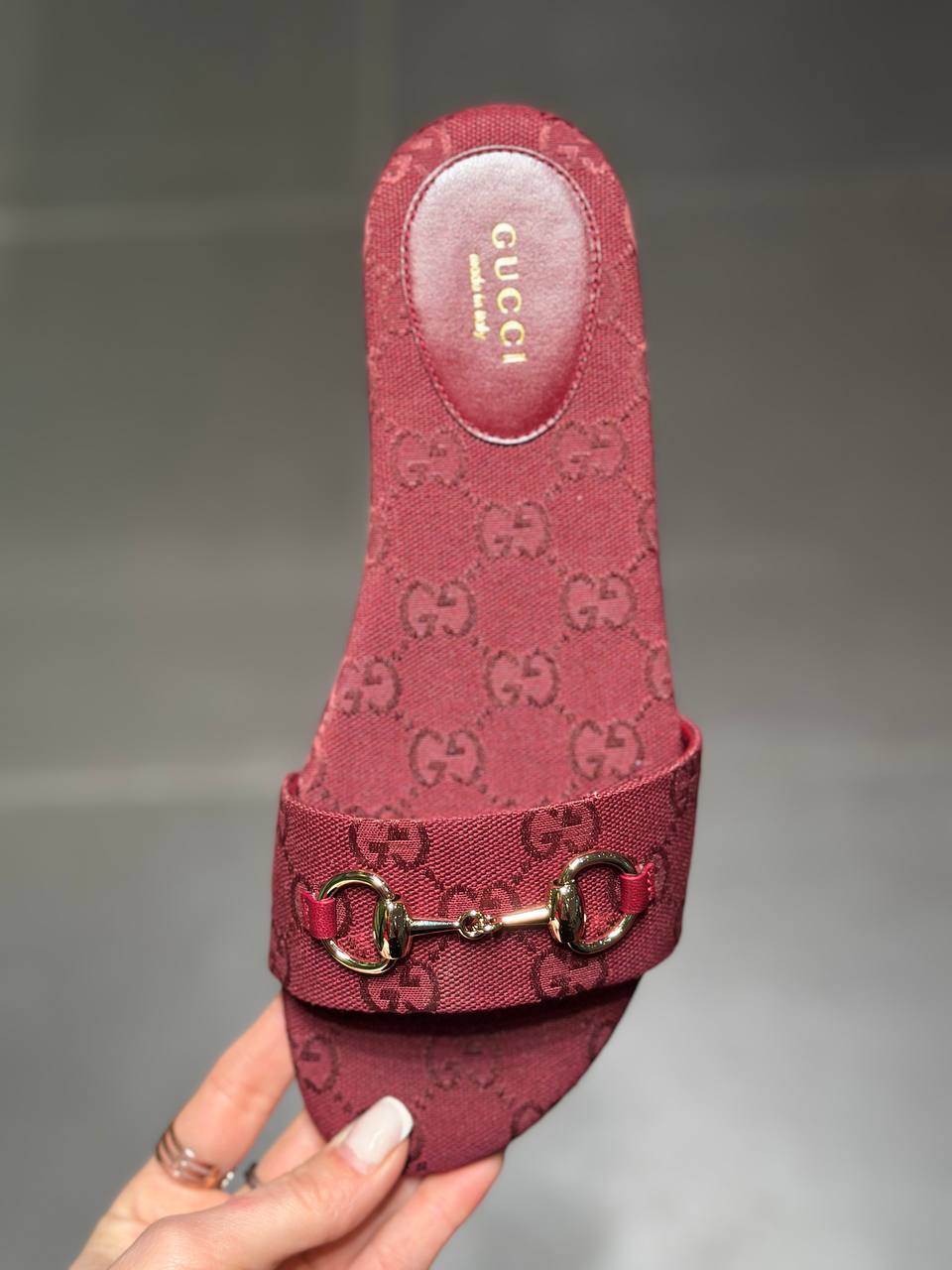 Элегантные женские шлепанцы Gucci в насыщенном бордовом цвете. Модель выполнена из плотного текстильного канваса с узнаваемым жаккардовым узором GG Supreme. Широкая перемычка декорирована знаковой золотистой фурнитурой Horsebit. Внутренняя часть также дополнена фирменной монограммой и кожаной вставкой с логотипом бренда на пятке. Состав: верх — текстиль (канвас GG), натуральная кожа; стелька — текстиль, кожа; подошва — натуральная кожа.