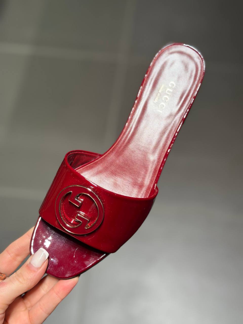 Элегантные женские шлепанцы Gucci выполнены из глянцевой лакированной кожи в глубоком бордовом оттенке. Модель отличается открытым фасоном и широкой перемычкой, декорированной крупным золотистым логотипом Interlocking G. На внутренней стельке расположено тиснение с названием бренда. Состав: 100% лакированная кожа.
