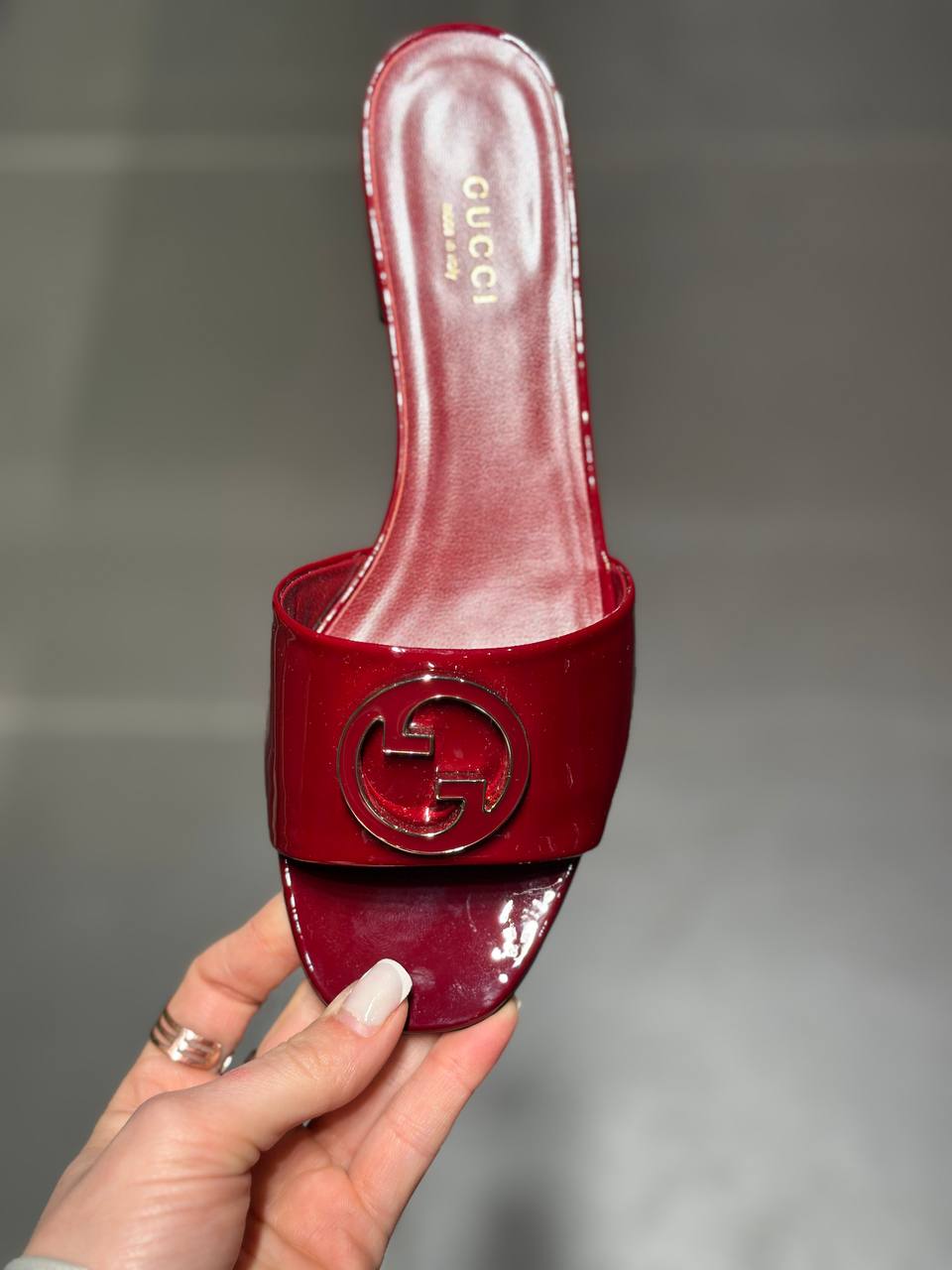 Элегантные женские шлепанцы Gucci, выполненные из глянцевой лакированной кожи насыщенного бордового цвета. Модель с открытым мысом декорирована крупным фирменным логотипом Interlocking G в тон изделия. Внутренняя стелька украшена золотистым тиснением с названием бренда. Состав: 100% натуральная лакированная кожа, кожаная подошва.