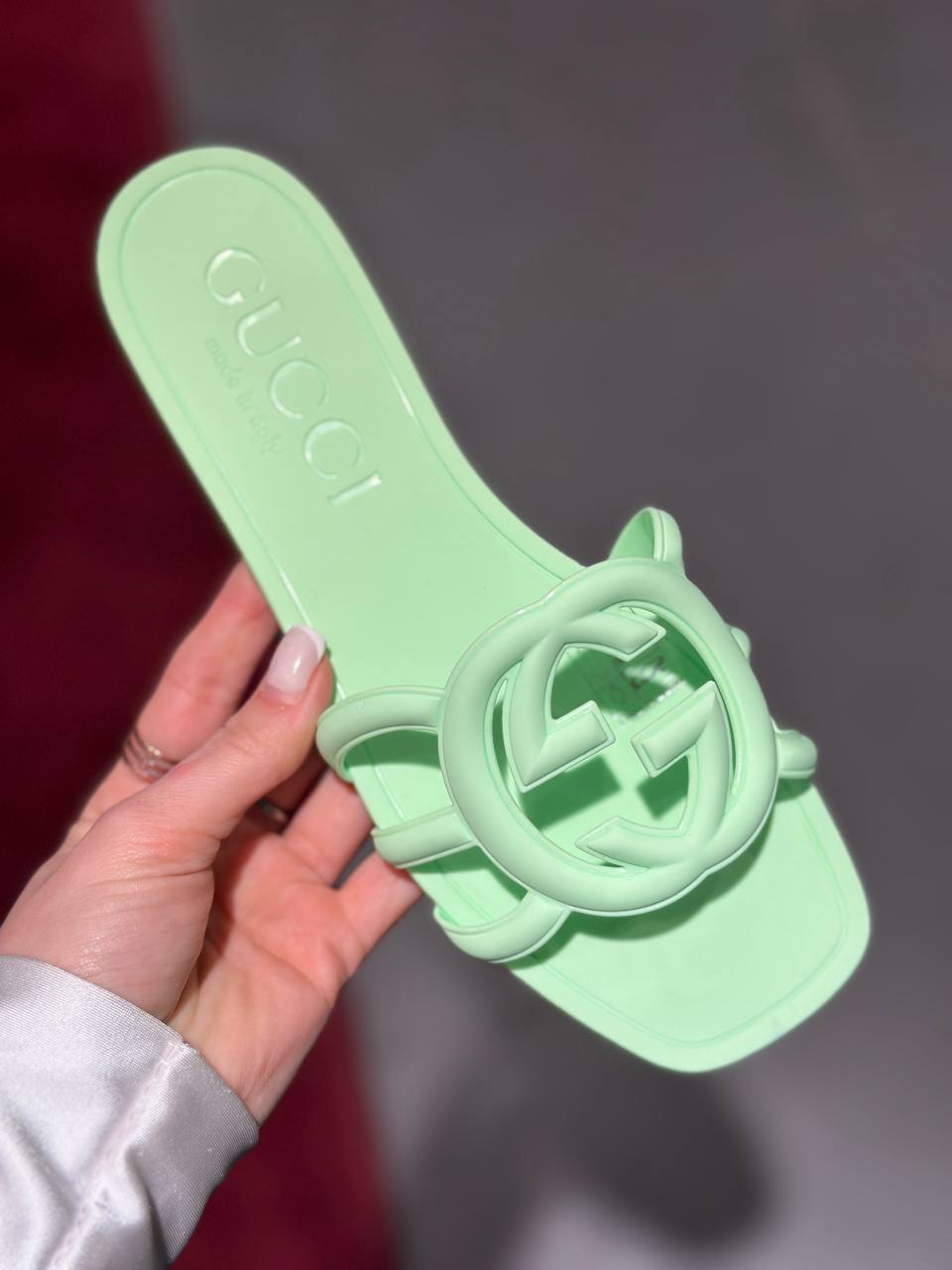 Стильные женские шлепанцы Gucci выполнены в нежном мятном цвете. Модель отличается широкой перемычкой, декорированной крупным объемным логотипом Interlocking G. Обувь на плоской подошве имеет открытый мыс и комфортную стельку с тисненым логотипом бренда. Идеальный вариант для летнего гардероба и отдыха. Состав: 100% резина.
