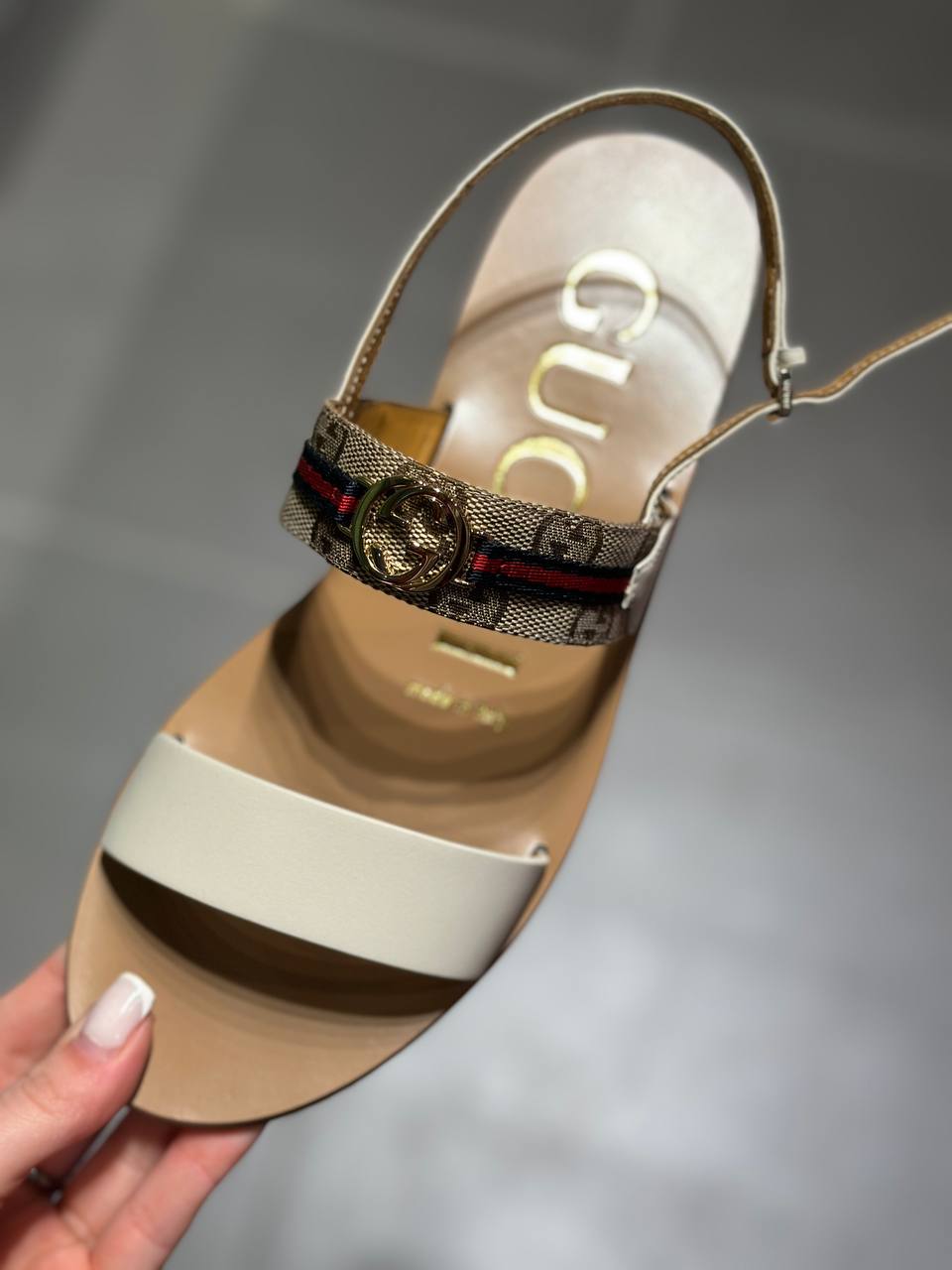 Элегантные женские босоножки от Gucci. Модель выполнена из сочетания гладкой натуральной кожи молочного цвета и текстильного ремешка с классическим принтом GG Supreme. Дизайн дополнен фирменной красно-зеленой лентой Web и золотистым металлическим логотипом Interlocking G. Обувь имеет открытый носок и фиксирующий ремешок на пятке. На стельке расположен крупный логотип бренда. Состав: натуральная кожа, текстиль, металл.