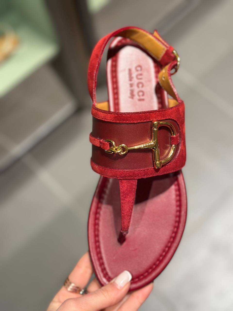 Элегантные женские сандалии Gucci в насыщенном бордовом цвете. Модель выполнена из сочетания натуральной замши и гладкой кожи. Декорированы знаковой золотистой металлической фурнитурой Horsebit на широком переднем ремешке. Дизайн дополнен Т-образным ремешком и регулируемой застежкой на щиколотке для надежной фиксации. На стельке расположено фирменное тиснение бренда. Состав: 100% натуральная замша, 100% натуральная кожа.