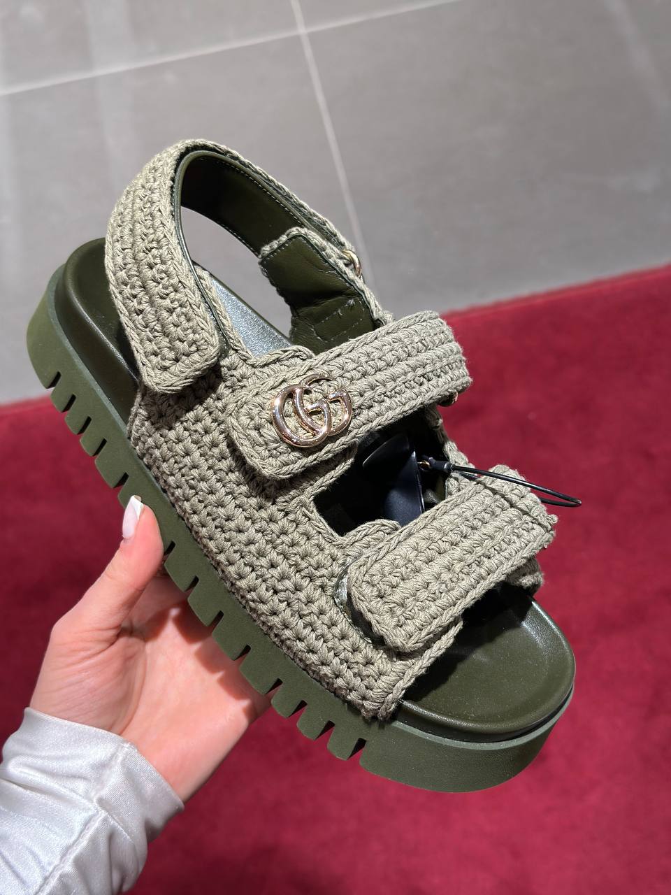 Женские сандалии на массивной платформе в цвете хаки. Модель выполнена с использованием фактурной вязки в технике кроше. Оснащена удобными регулируемыми ремешками на липучках, один из которых украшен золотистой металлической фурнитурой в виде логотипа GG. Рельефная тракторная подошва обеспечивает устойчивость. Состав: верх — хлопок, подкладка — натуральная кожа, подошва — полимерный материал.