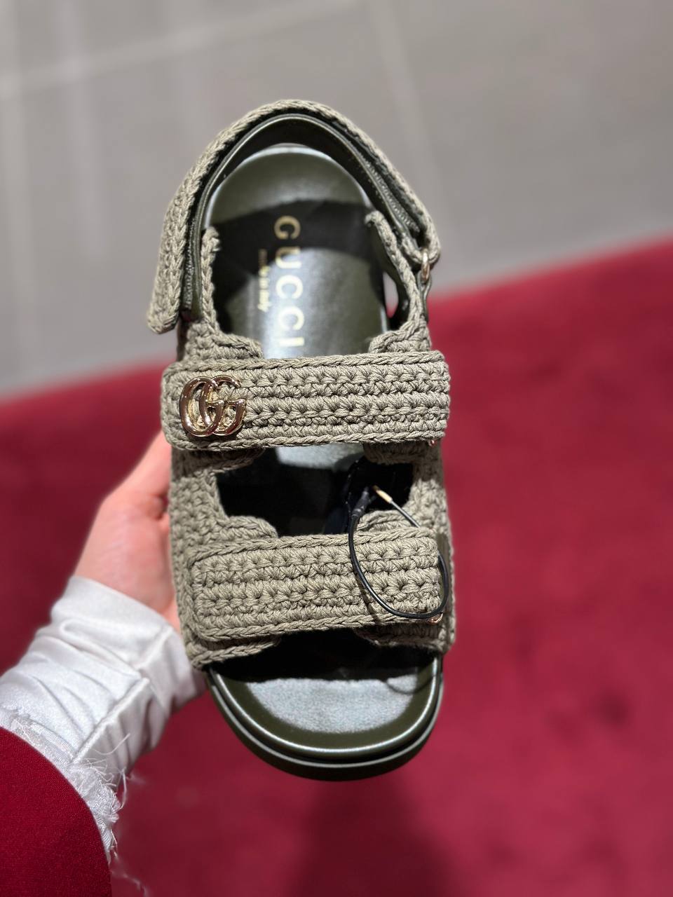 Элегантные сандалии Gucci оливкового цвета, выполненные из фактурного вязаного трикотажа в технике кроше. Модель оснащена тремя регулируемыми ремешками на липучках для идеальной фиксации стопы. Верхний ремешок декорирован узнаваемой металлической фурнитурой Double G золотистого цвета. Внутренняя стелька с логотипом бренда и массивная подошва обеспечивают комфорт в течение дня. Состав: 100% хлопок, подошва — резина, детали — натуральная кожа.