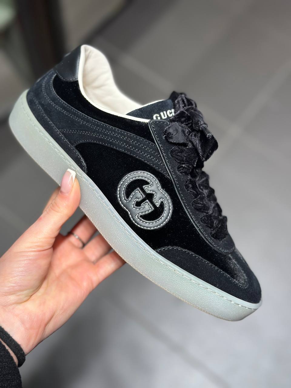 Элегантные женские кеды Gucci, выполненные из сочетания черного бархата и вставок из натуральной замши. Модель декорирована крупным вышитым логотипом бренда на боковой панели и фирменной надписью на язычке. Изделие дополнено классической шнуровкой и массивной резиновой подошвой серого цвета. Состав: 100% текстиль (бархат), 100% натуральная замша, подкладка из 100% кожи, подошва из 100% каучука.