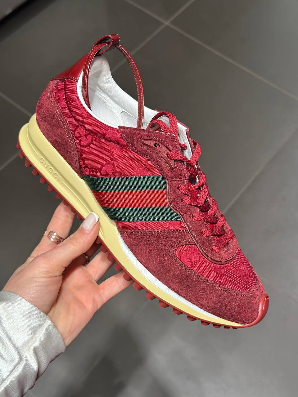 Кроссовки Gucci бордового цвета, выполненные из сочетания текстиля с культовым узором GG Supreme и вставок из натуральной замши. Модель украшена фирменной красно-зеленой лентой Web на боковых панелях. На массивной бежевой подошве расположено тиснение с логотипом бренда. Контрастная красная подметка с характерным протектором обеспечивает отличное сцепление. Внутренняя отделка выполнена из светлой кожи. Состав: натуральная замша, текстиль, натуральная кожа, резина.
