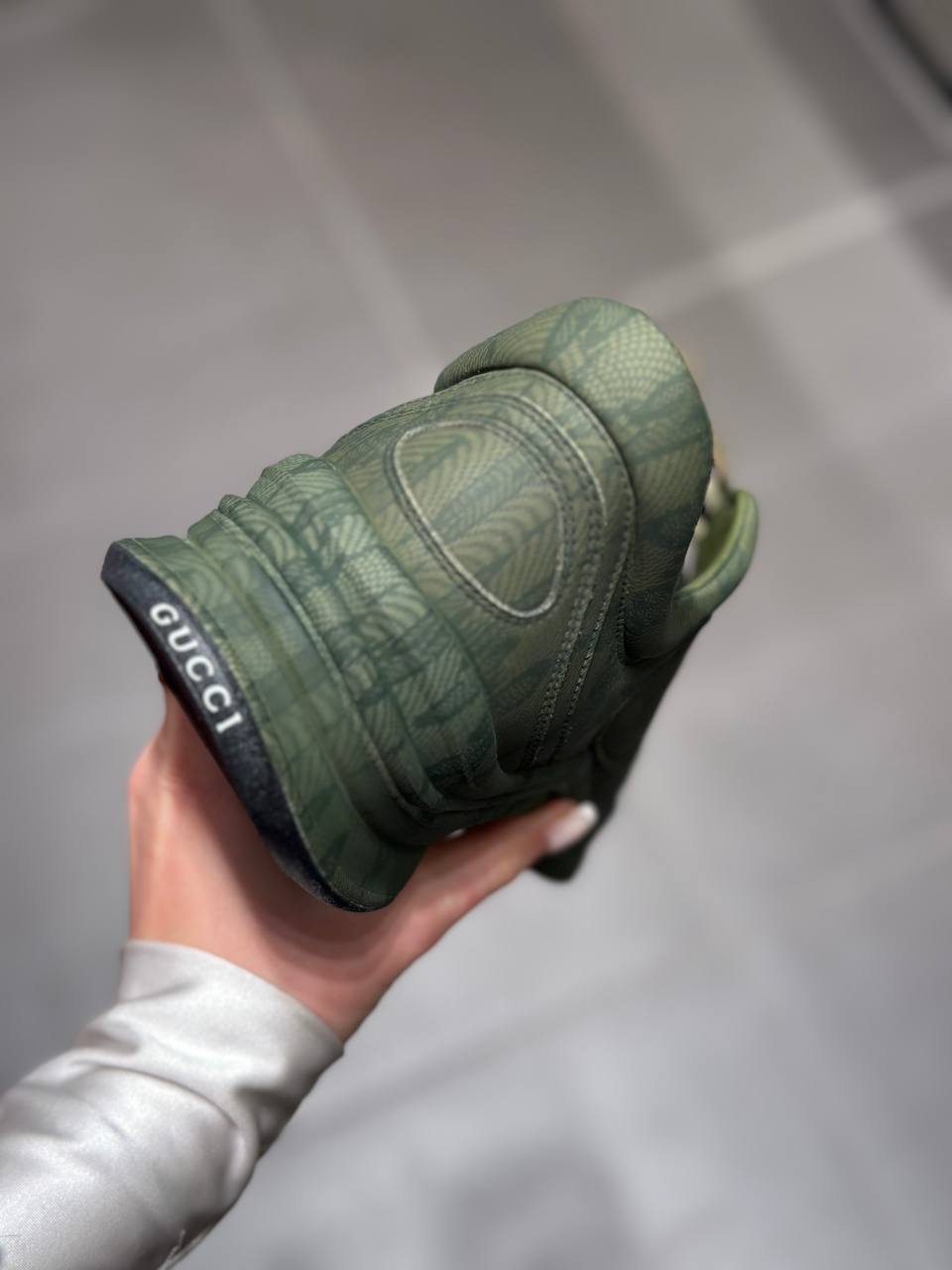 Женские кроссовки Gucci в темно-зеленом цвете с оригинальным принтом в виде пальмовых листьев. Модель на массивной подошве дополнена контрастным логотипом бренда на боковой части пятки. Состав: натуральная кожа, текстиль, резиновая подошва.