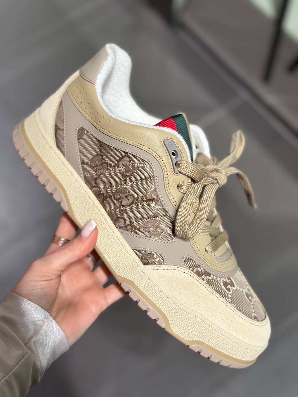 Стильные женские кеды выполнены в сочетании культовой канвы GG Supreme в бежево-коричневых тонах и вставок из натуральной кожи и замши кремового цвета. Модель декорирована фирменной красно-зеленой полосой Web на язычке. Классический силуэт на шнуровке дополнен прочной резиновой подошвой. Состав: текстиль (канва), натуральная кожа, натуральная замша, резиновая подошва.