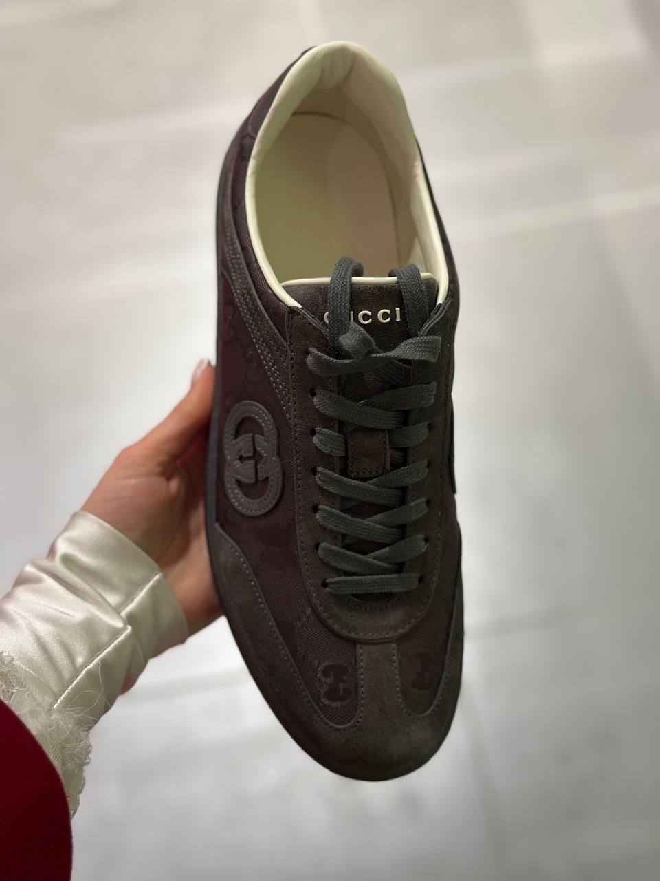 Элегантные низкие кеды от Gucci, выполненные из знакового текстиля GG Supreme и дополненные вставками из мягкой натуральной замши темно-коричневого цвета. Модель декорирована узнаваемым патчем с логотипом Interlocking G на боковой панели и фирменным брендингом на язычке. Износостойкая подошва и светлая внутренняя отделка обеспечивают комфорт и премиальный вид. Состав: верх — 60% текстиль, 40% натуральная кожа (замша); подкладка — 100% натуральная кожа; подошва — 100% резина.