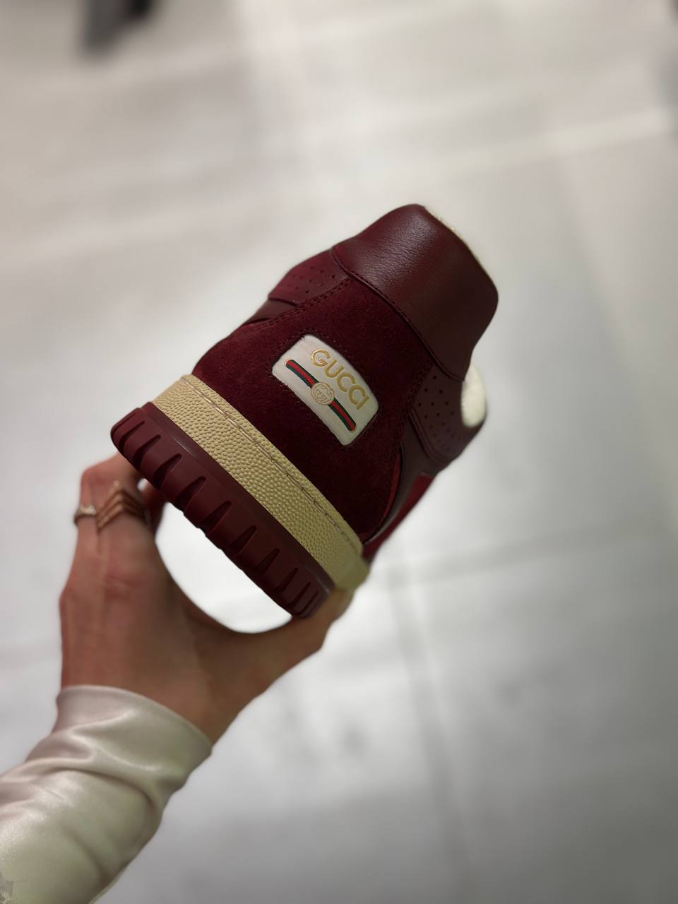 Стильные женские кеды Gucci в насыщенном бордовом цвете. Модель выполнена из сочетания высококачественной натуральной замши и гладкой кожи. На заднике расположен белый патч с золотистым логотипом Gucci и классической красно-зеленой полосой Web. Двухцветная массивная подошва кремового и бордового цвета подчеркивает ретро-эстетику модели. Внутренняя часть дополнена мягкой меховой подкладкой для дополнительного тепла. Состав: натуральная замша, натуральная кожа, мех овчины, резиновая подошва.