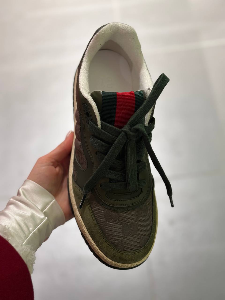 Кроссовки Gucci в оливково-зеленом цвете. Модель выполнена из комбинации текстиля с фирменным принтом GG Supreme, натуральной кожи и замши. Язычок декорирован узнаваемой красно-зеленой лентой Web. Классическая шнуровка в тон изделия и контрастная светлая подошва. Состав: натуральная кожа, натуральная замша, текстиль, резина.