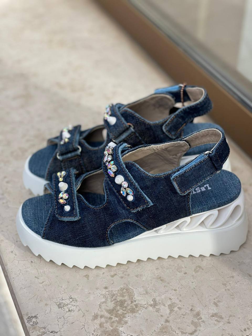 Женские сандалии на массивной белой платформе. Верх выполнен из синего денима и дополнен регулируемыми ремешками на липучках. Обувь декорирована сверкающими стразами разного размера и белыми бусинами. На стельке видна часть логотипа ‘LEST’.