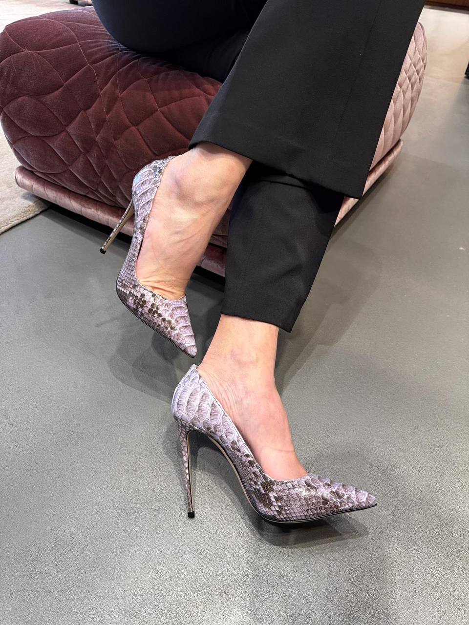 Элегантные женские туфли-лодочки с заостренным мысом на высокой шпильке. Модель выполнена в серо-сиреневой цветовой гамме с выразительным принтом под змеиную кожу (питон).