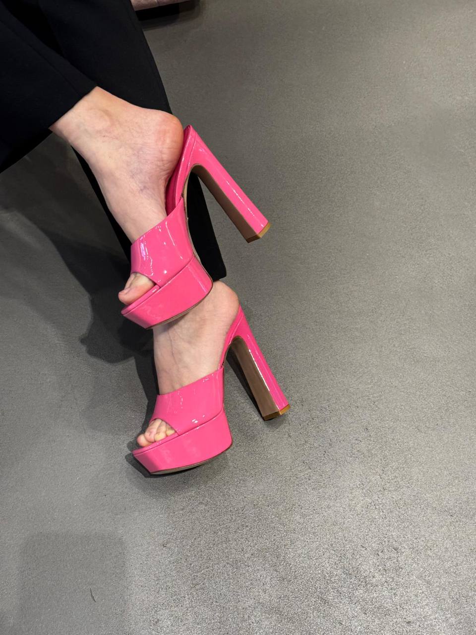 Ярко-розовые лакированные босоножки на высокой платформе и массивном устойчивом каблуке. Модель с открытым мысом и открытой пяткой, выполнена в стиле мюли.