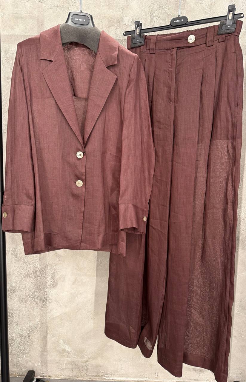 Элегантный женский костюм-двойка от Marella в глубоком бордовом цвете. Комплект включает однобортный жакет свободного кроя на двух пуговицах с классическими лацканами и широкие брюки-палаццо с высокой посадкой. Изделие выполнено из легкой, слегка полупрозрачной ткани с благородным блеском. Брюки дополнены защипами у пояса и шлевками для ремня. Логотип Marella нанесен на вешалки. Состав: 70% лен, 30% шелк.