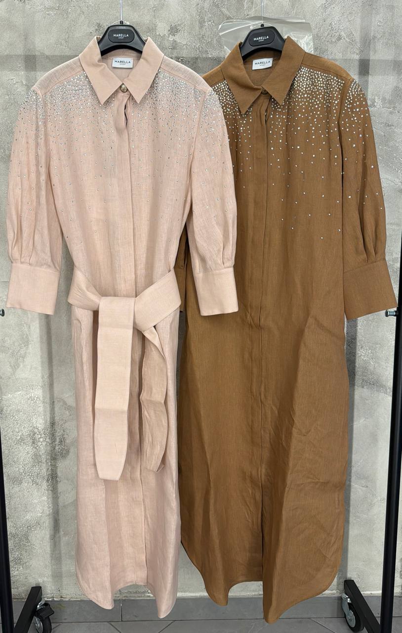 Элегантное платье-рубашка Marella Sport свободного кроя, представленное в двух оттенках: нежно-бежевом и насыщенном коричневом. Модель макси-длины выполнена из ткани с выраженной льняной фактурой. Верхняя часть изделия и плечи декорированы россыпью сияющих страз, создающих эффект мерцающего градиента. Платье дополнено классическим отложным воротником, длинными рукавами с широкими манжетами и съемным поясом в тон для акцента на талии. Состав: 100% лен.