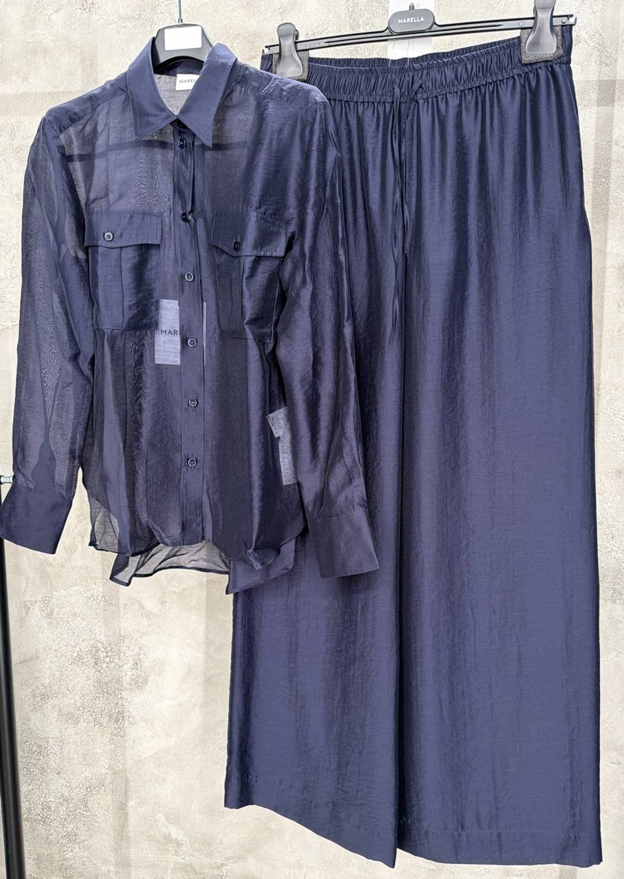 Элегантный женский костюм-двойка темно-синего цвета от бренда Marella. Комплект состоит из легкой полупрозрачной рубашки и широких брюк. Рубашка прямого кроя с длинными рукавами, отложным воротником и двумя накладными карманами на груди. Брюки фасона палаццо имеют свободный силуэт и эластичный пояс на кулиске со шнурком. Ткань отличается благородным шелковистым блеском и тонкой фактурой. Состав: 100% полиэстер.