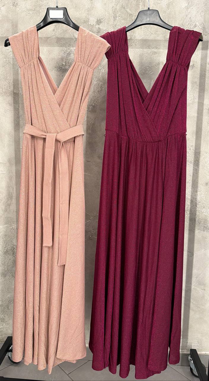 Элегантные вечерние платья длины макси, представленные в нежном пудрово-розовом и глубоком бордовом цветах. Изделия выполнены из легкой ткани с деликатным мерцающим блеском люрекса. Фасон отличается V-образным вырезом на запах и широкими драпированными бретелями. Линия талии акцентирована поясом-лентой в тон платья, переходящим в свободную летящую юбку в пол. Состав: полиэстер 95%, эластан 5%.